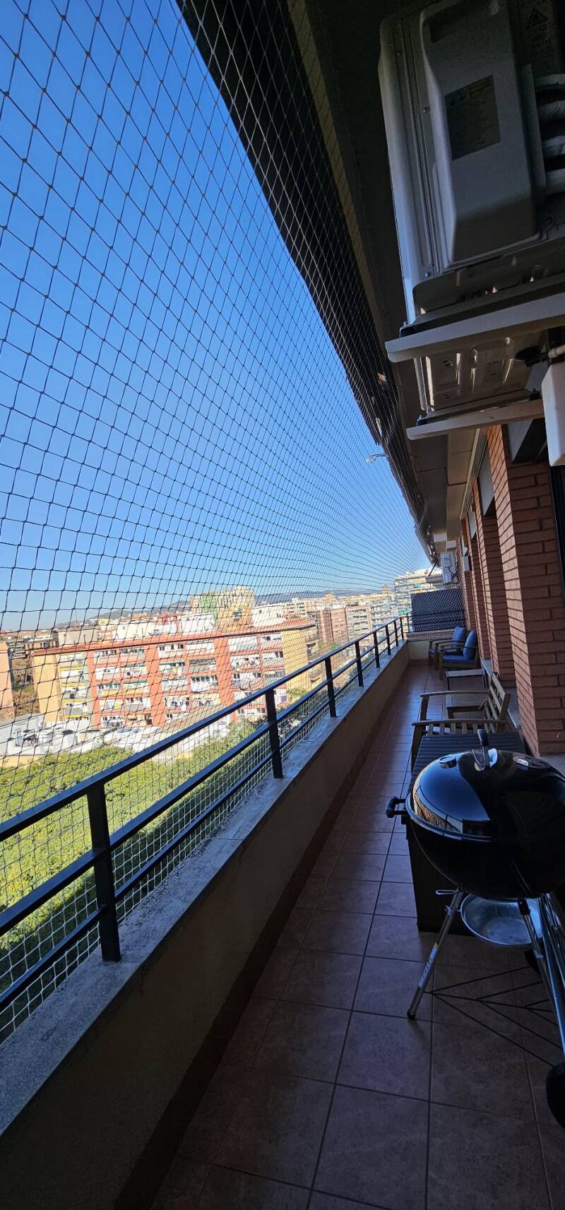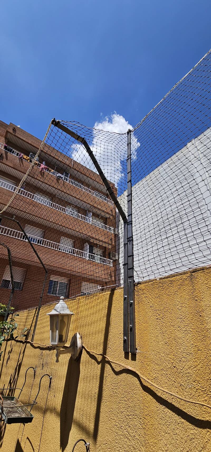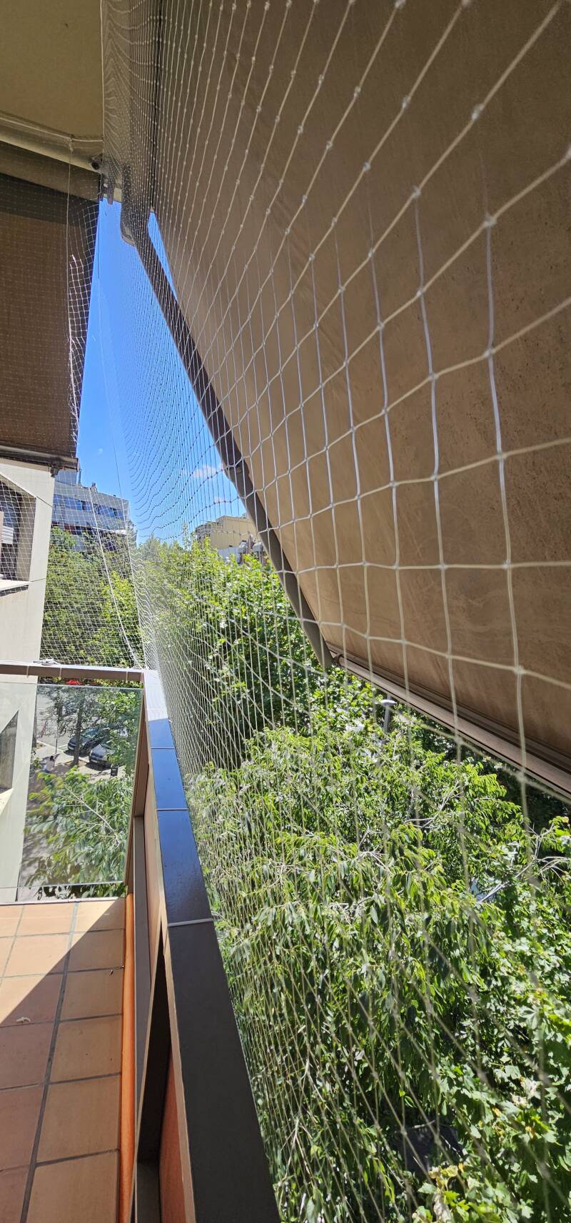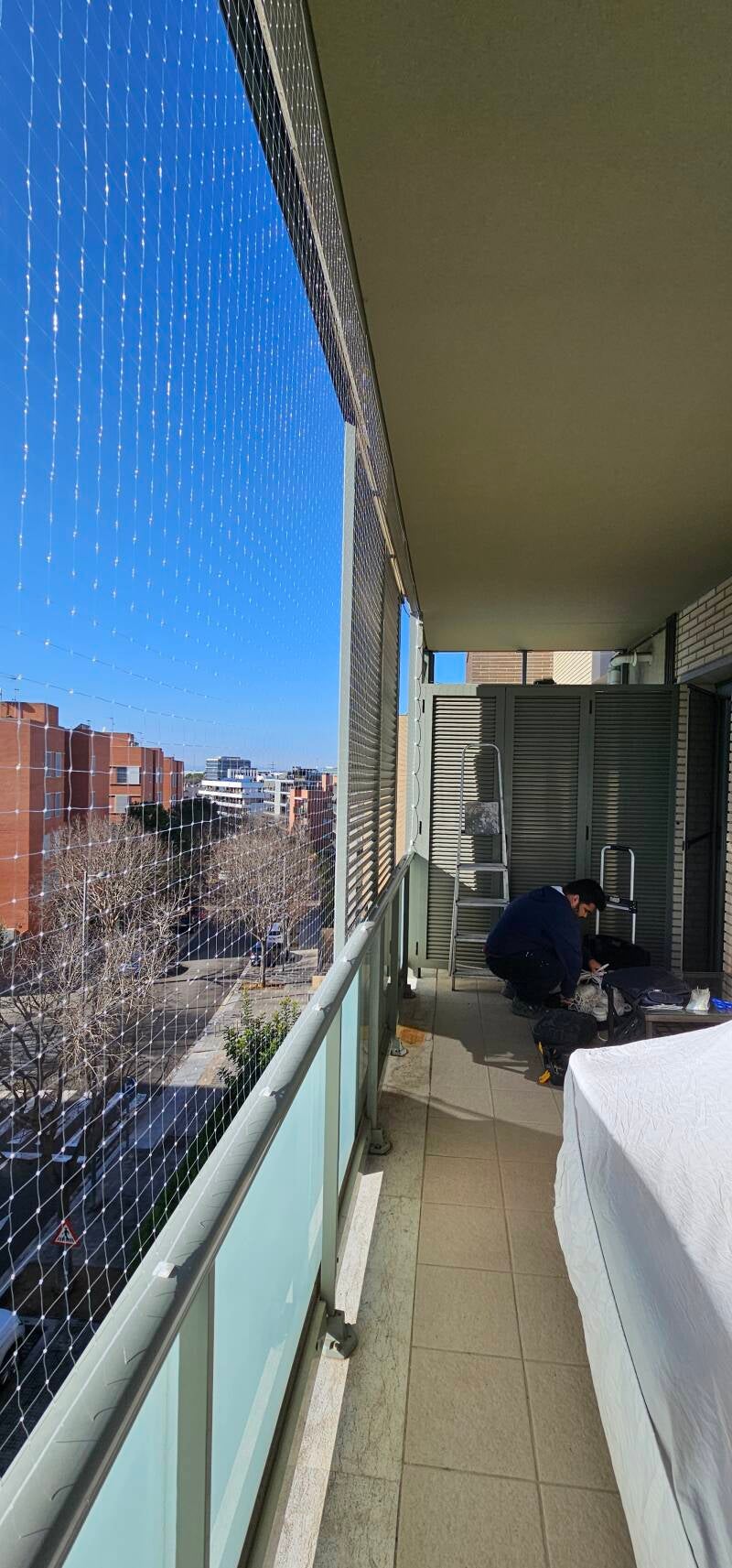 Redes de protección para balcones, instaladas con ganchos y cuerdas para la máxima seguridad.