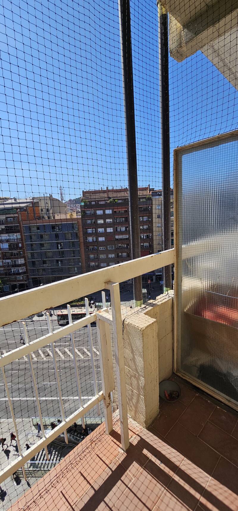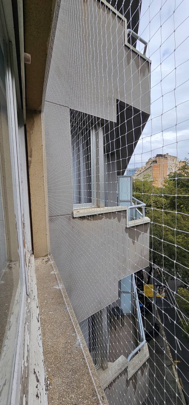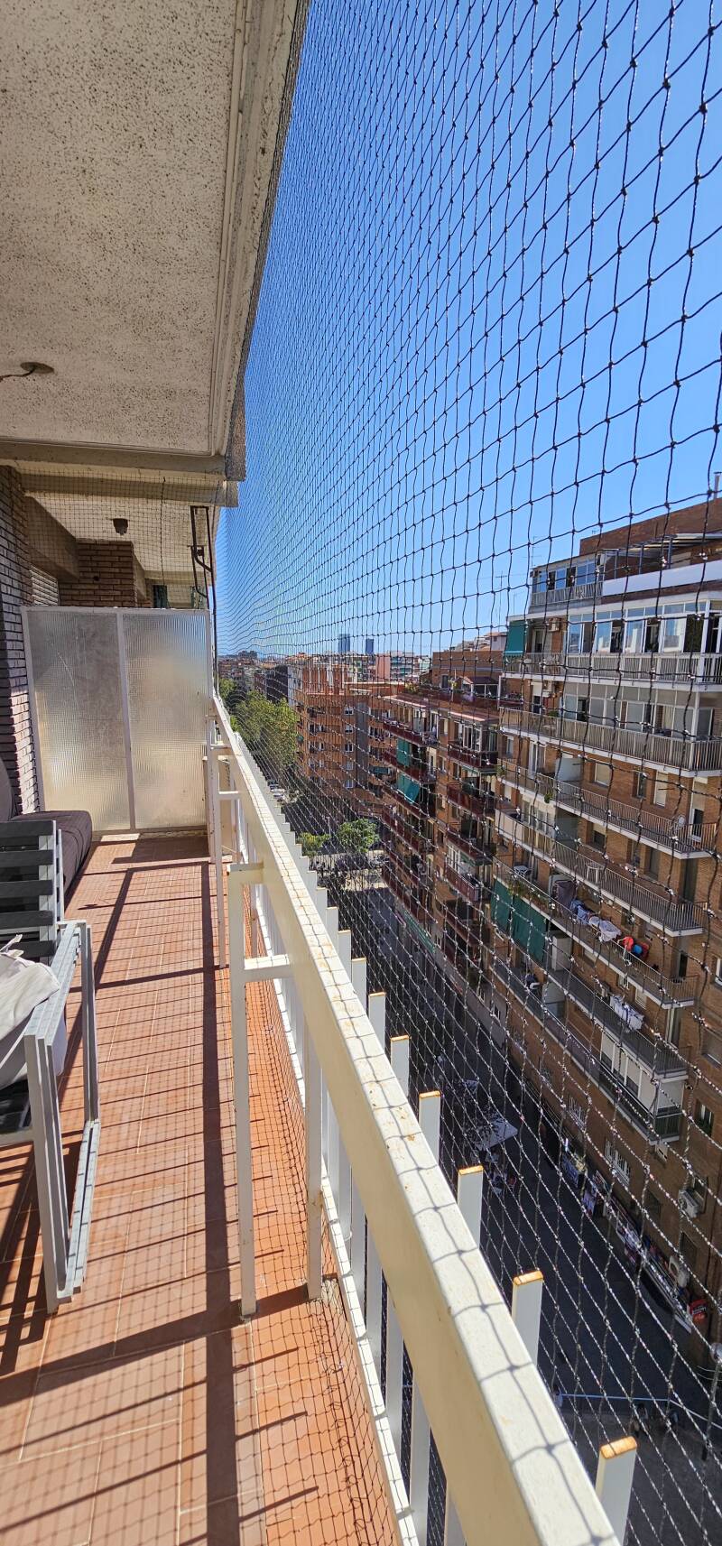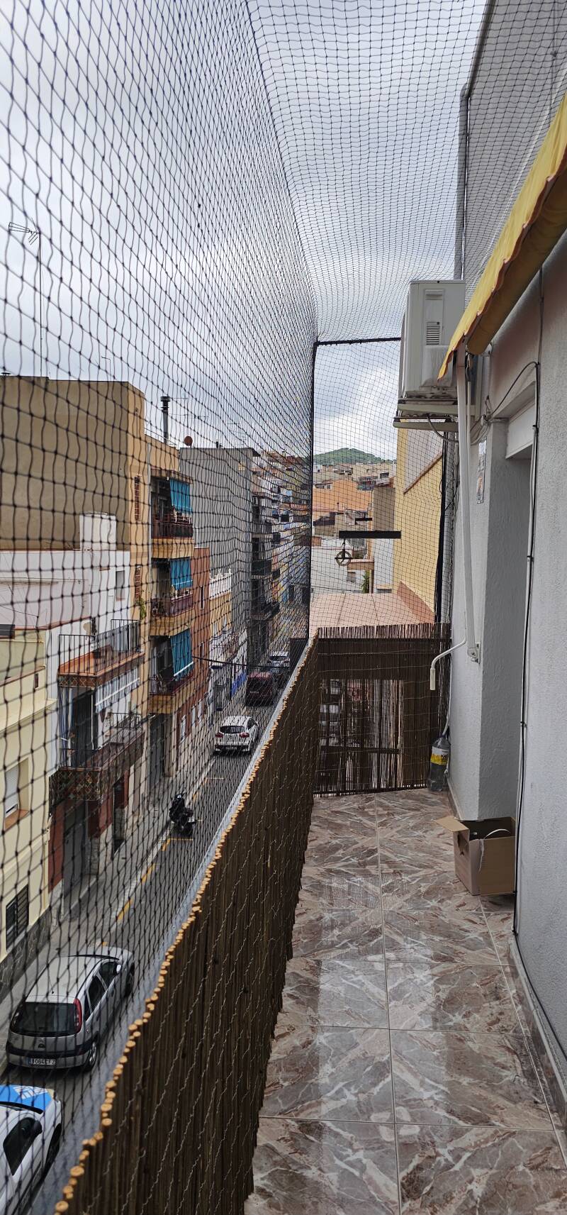 Redes de protección para balcones, instaladas con ganchos y cuerdas para la máxima seguridad.